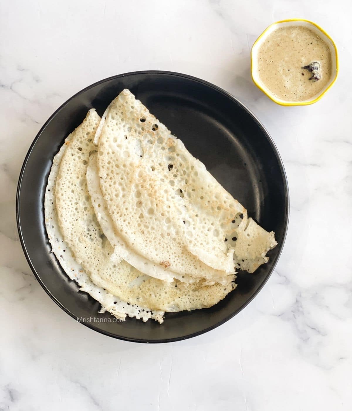 Neer dosa pairs beautifully with South Indian coconut chutney, peanut coconut chutney, tomato-onion chutney, Sambar with mullangi, and vegan curries like aloo kurma, bottle gourd kurma, and avarekalu sagu recipe.